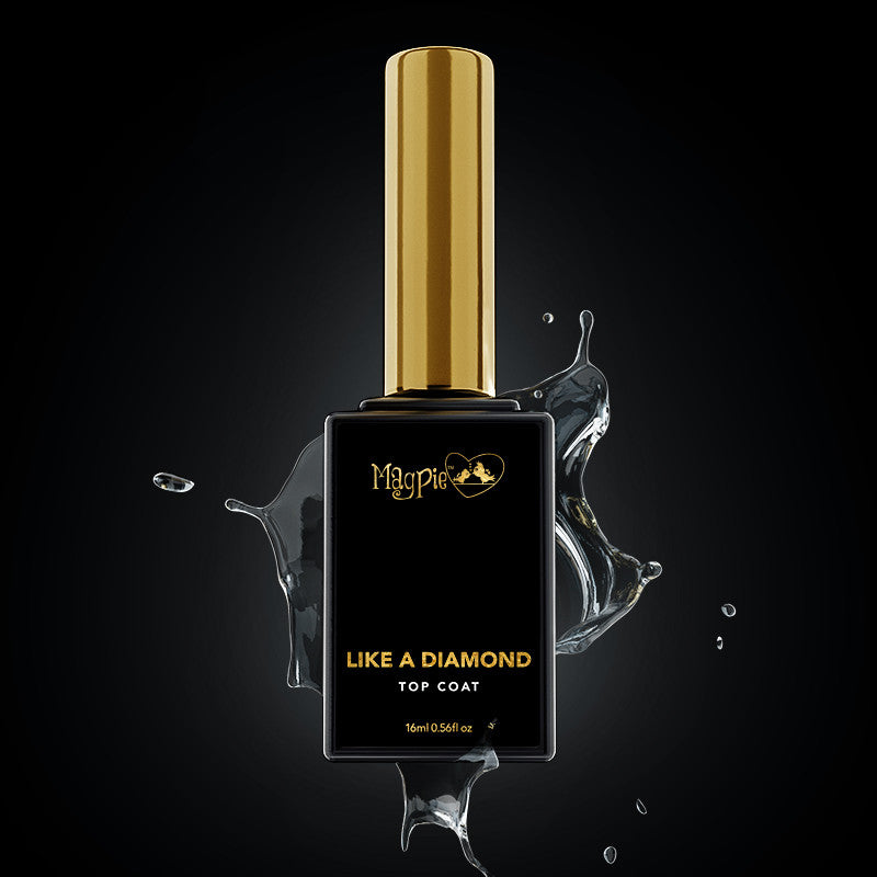 LIKE A DIAMOND - A super shiny, high durability, lasting shine top coat. A perfect viscosity to prevent flooding side walls and great for smooth glitter coverage. Cleanse the inhibition layer with Magpie Cleanser. HEMA Free.